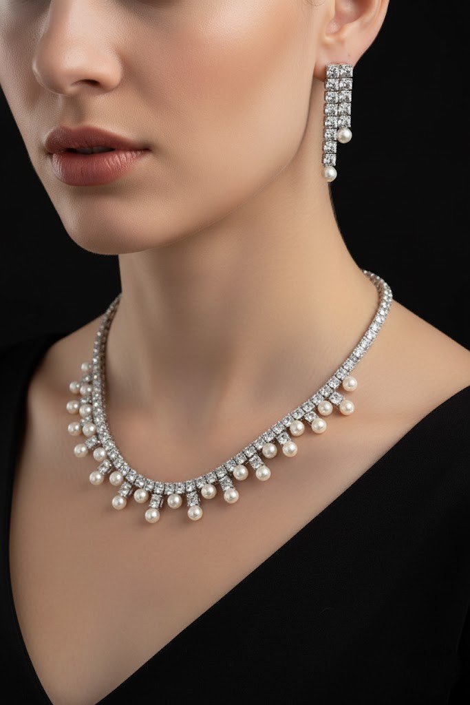The geometric necklace design with delicate pearl drops adds a soft, feminine touch.