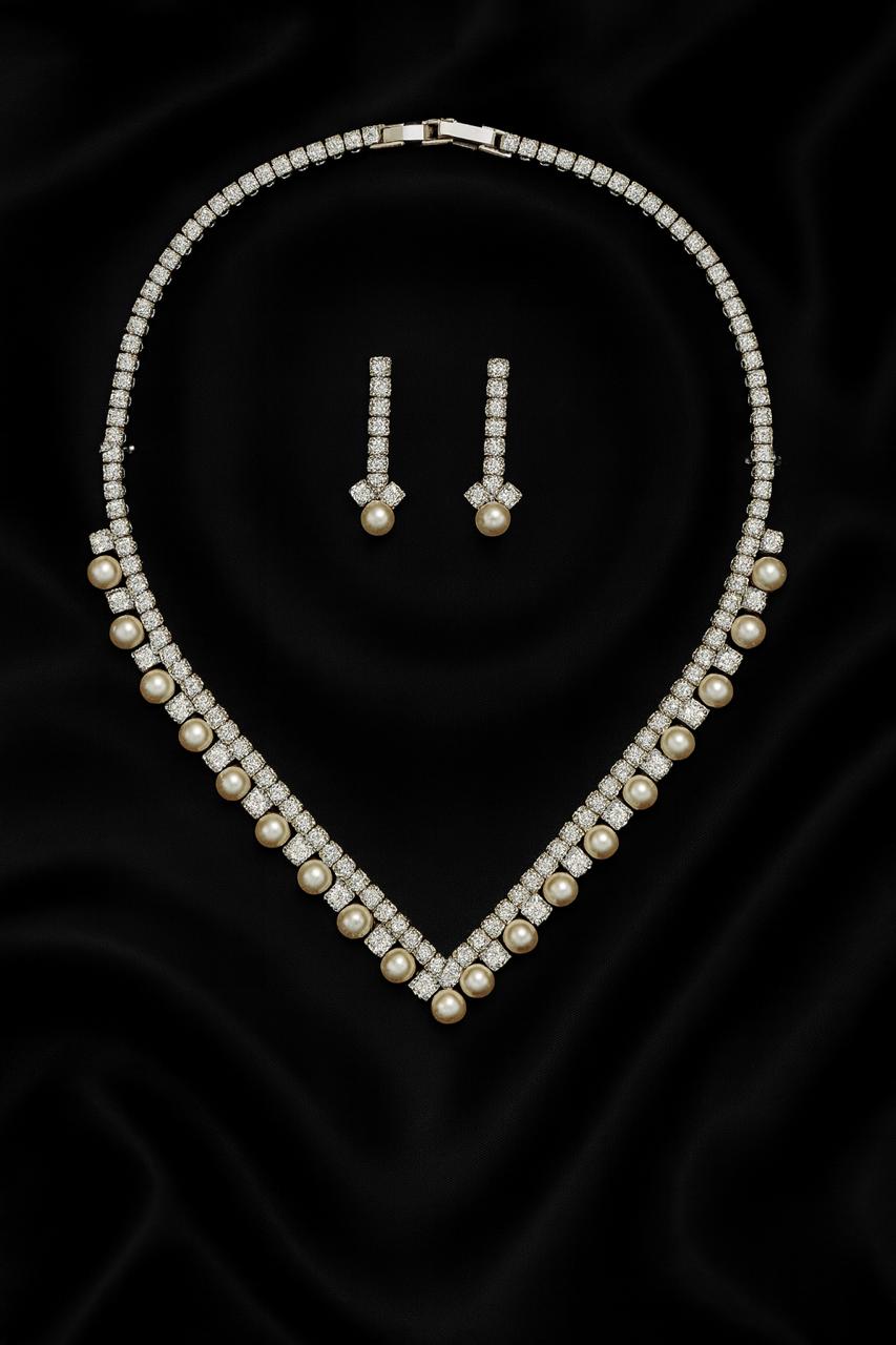Shine with royal elegance wearing this luxury crystal and pearl jewelry set, designed in a refined V-shape.