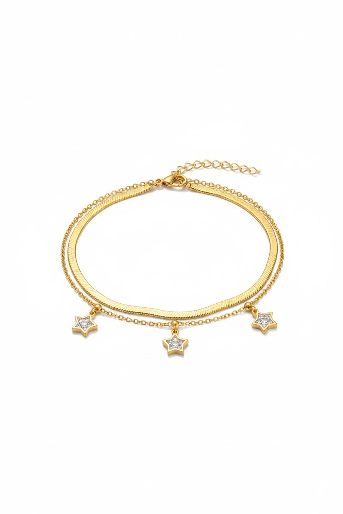 Crafted from high-quality stainless steel with a gold plating, this bracelet features a layered design combining a flat snake chain with a delicate chain adorned with sparkling crystal-studded star charms. It adds a touch of shimmer and elegance to your look, making it perfect for daily wear or special occasions. An chic and modern piece, suitable as a thoughtful gift for friends or a subtle addition to your personal collection.