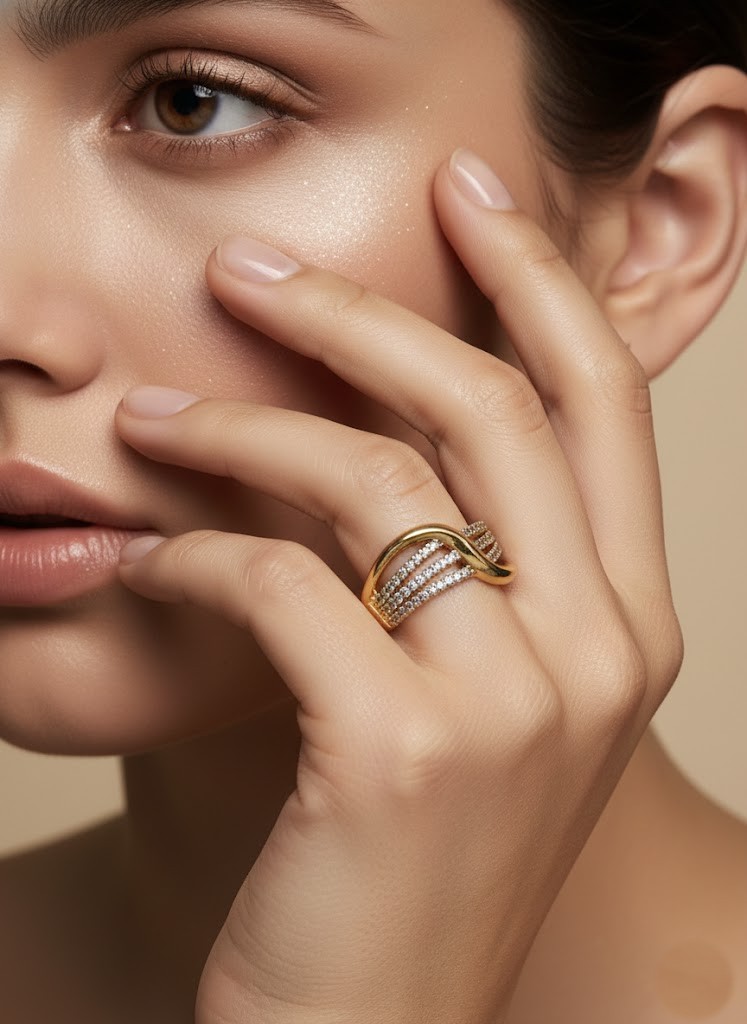 This women’s ring features a unique intertwined design crafted from gold-plated metal, adorned with sparkling crystal stones that give it a special radiance. Perfect for adding a touch of sophistication to your daily outfits, it also enhances the beauty of your hands for special occasions and evening events. An elegant and distinctive piece, suitable as a wonderful gift for friends and loved ones to celebrate their cherished moments.